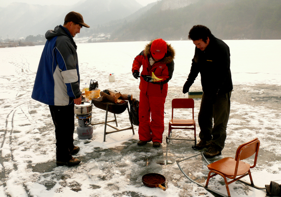 아침에 눈을 떠 시원한 공기에 정신을 차리고 나서 좋은 추억을 하나 더 만들기 위해서 얼음낚시를 가기로 했다.