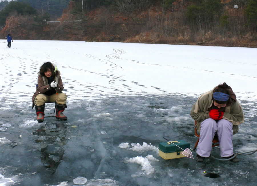 빙어낚시 삼매경에 빠진 집사람과 콩밭님 부인입니다.
