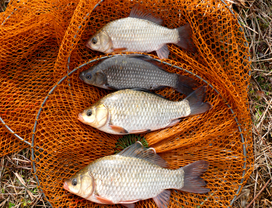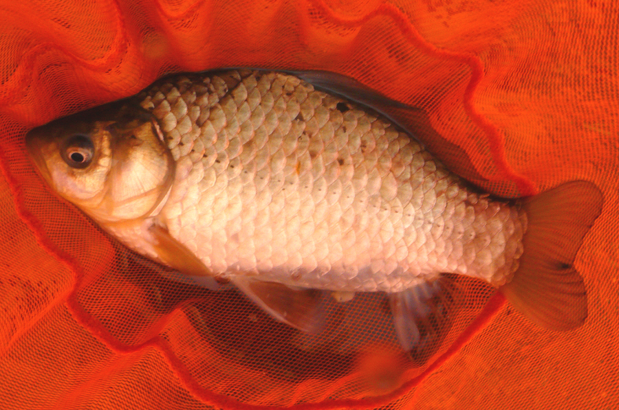 관리비를 받는 낚시터에서 어부는 그물을 치고 붕어를 걷어 냅니다.