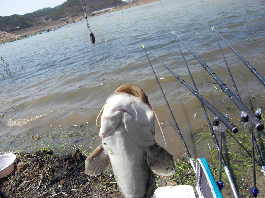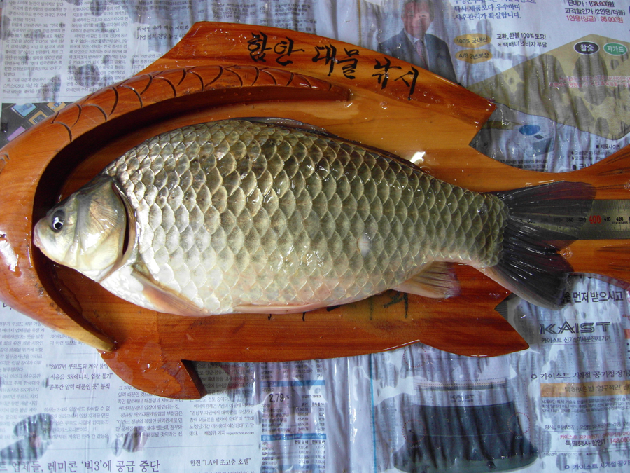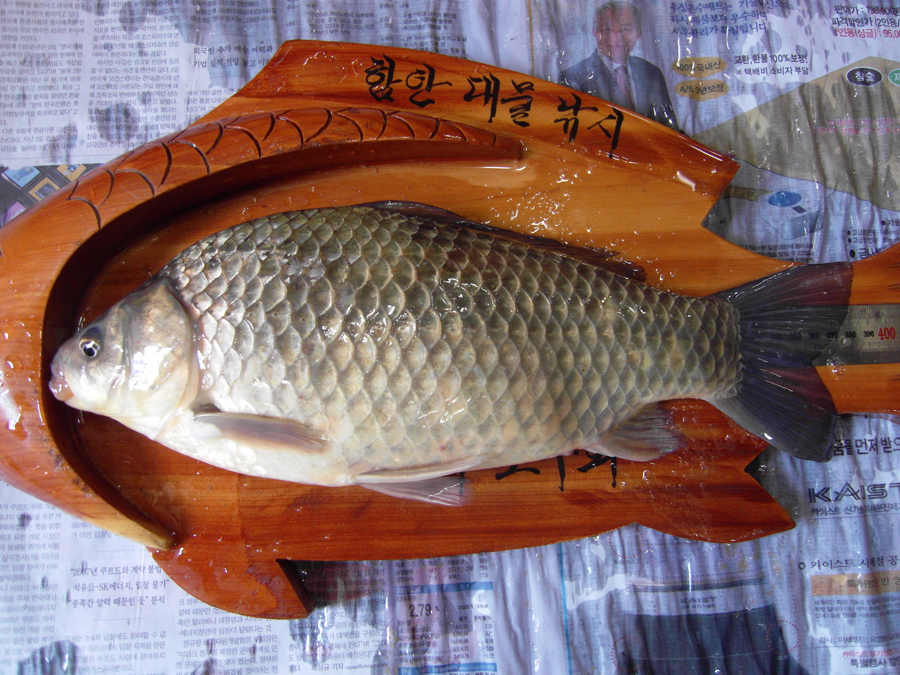 배스려니 생각하고 별로 신경을 쓰지 않고 챈 게...^^ 아싸!! 족히 30cm급 후반은 되 보이는 붕어다!!