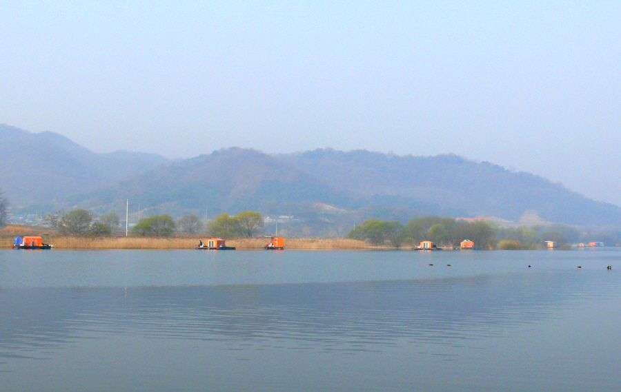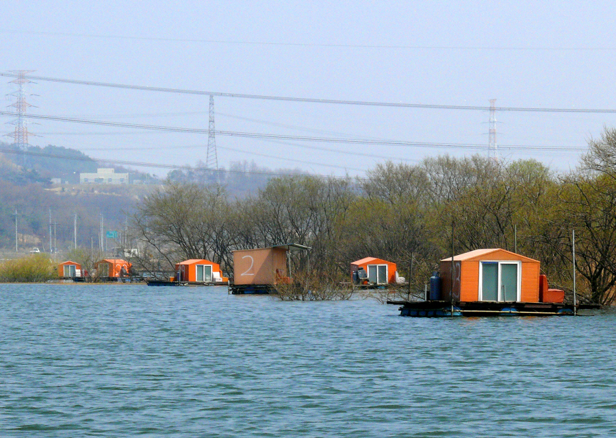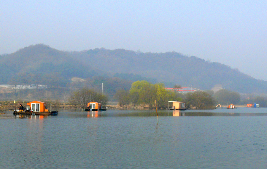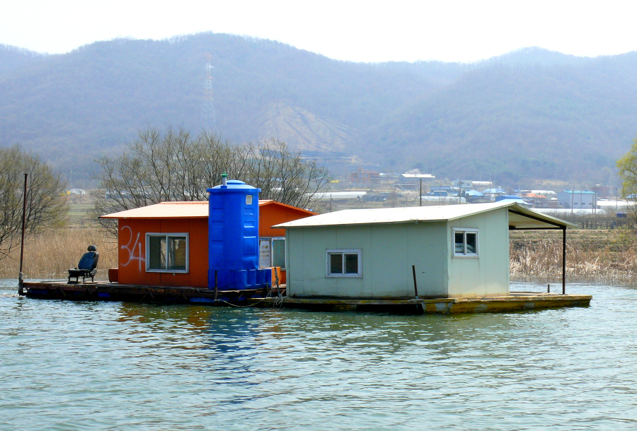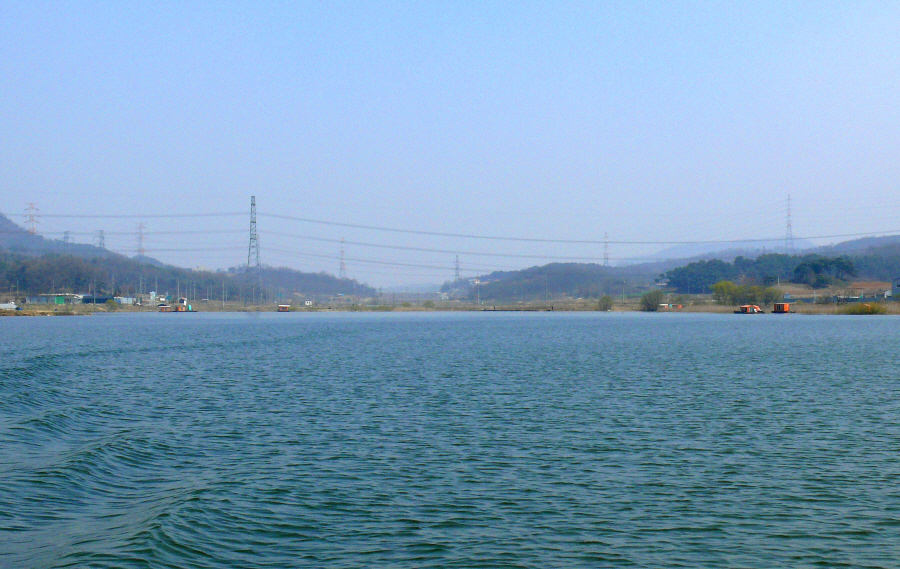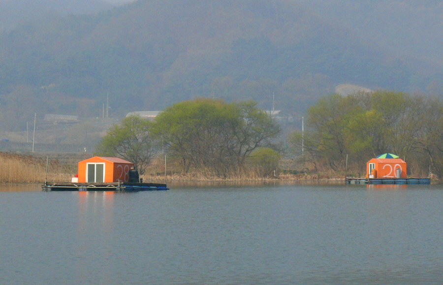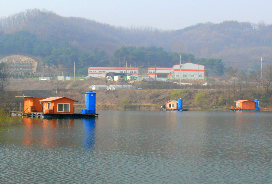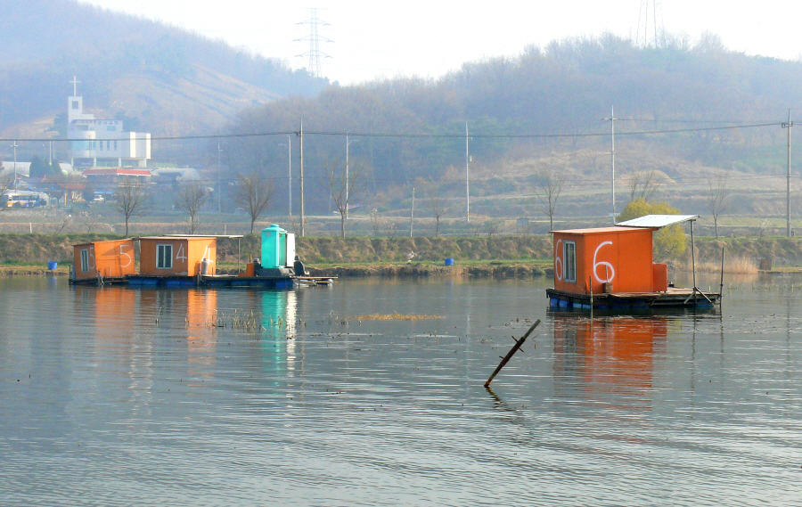 안골지 상류 좌측편에 위치한 수상좌대들 모습