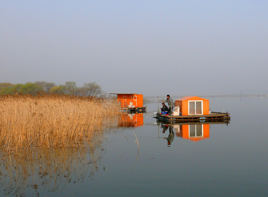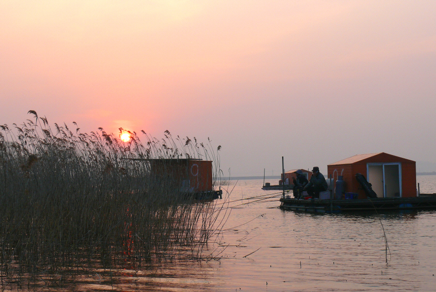 연안 수초대에 자리잡은 수상좌대 모습