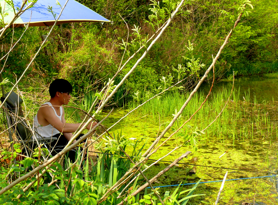 뜨거운 햇볕이 내리쬐는 소류지의 한 귀퉁이에 모자지간에 한대씩 채비를 만들어 주고 필자는 그늘에서 휴식을 취하면서