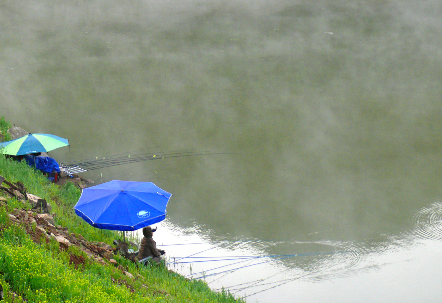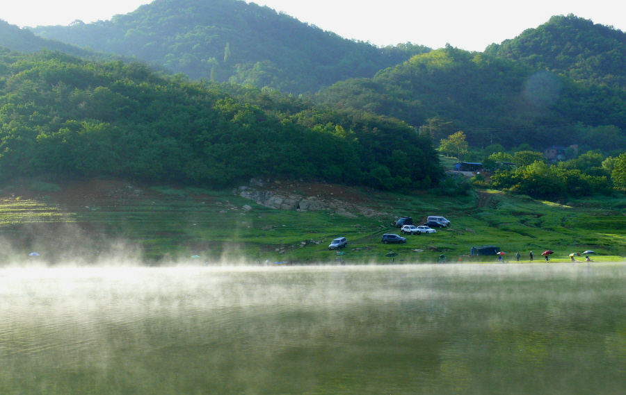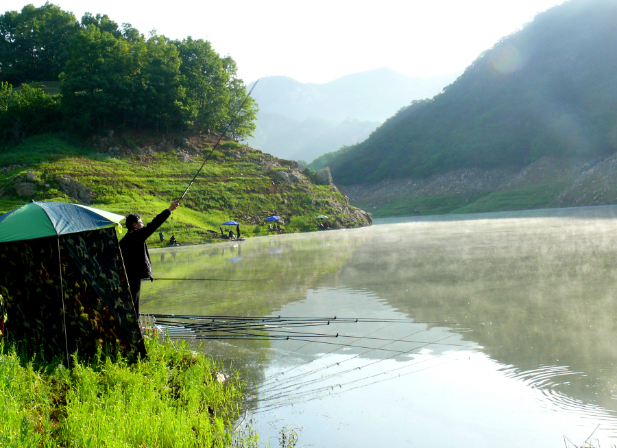 물안개 자욱하게 피어 오르지만 입질은 없습니다.