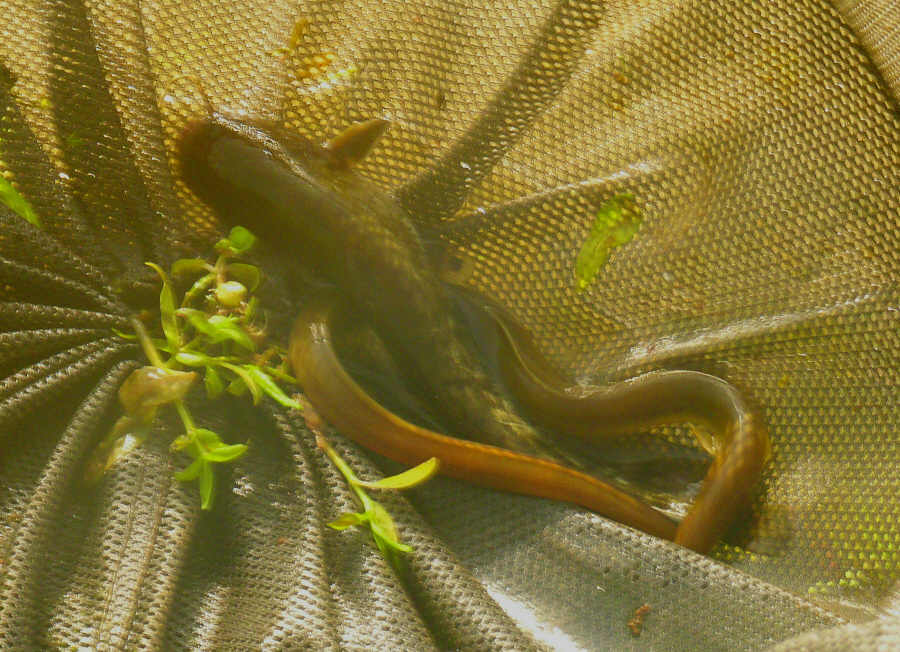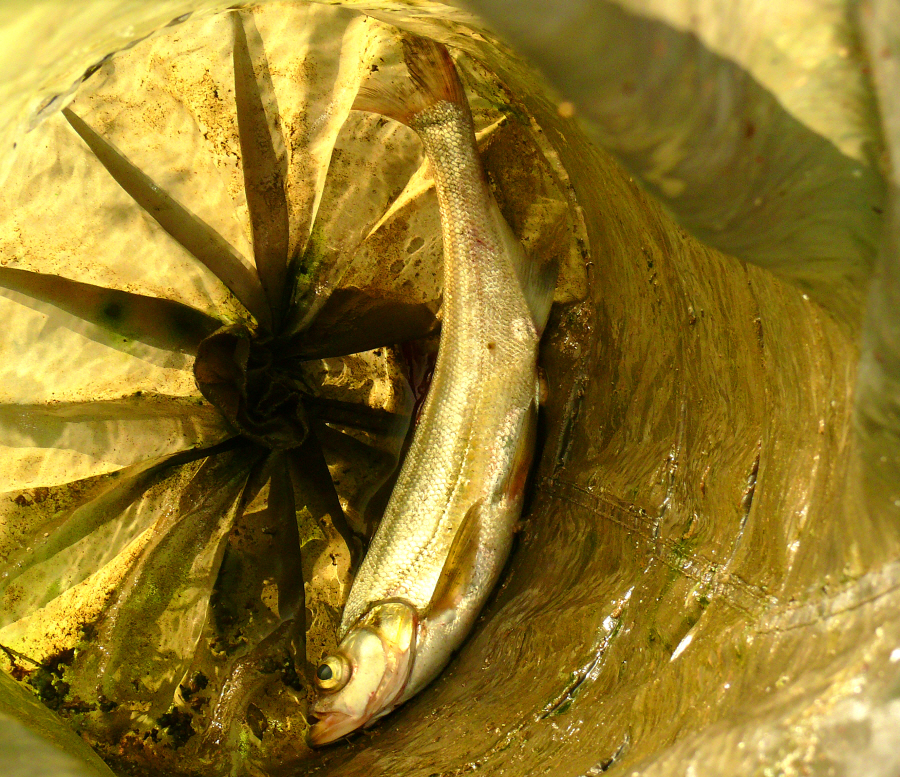 빈작의 살림망 속을 들여다 보니 장어와 강준치 메기만 달랑 들어 있을 뿐 보고픈 충주댐 붕어는 없다.
