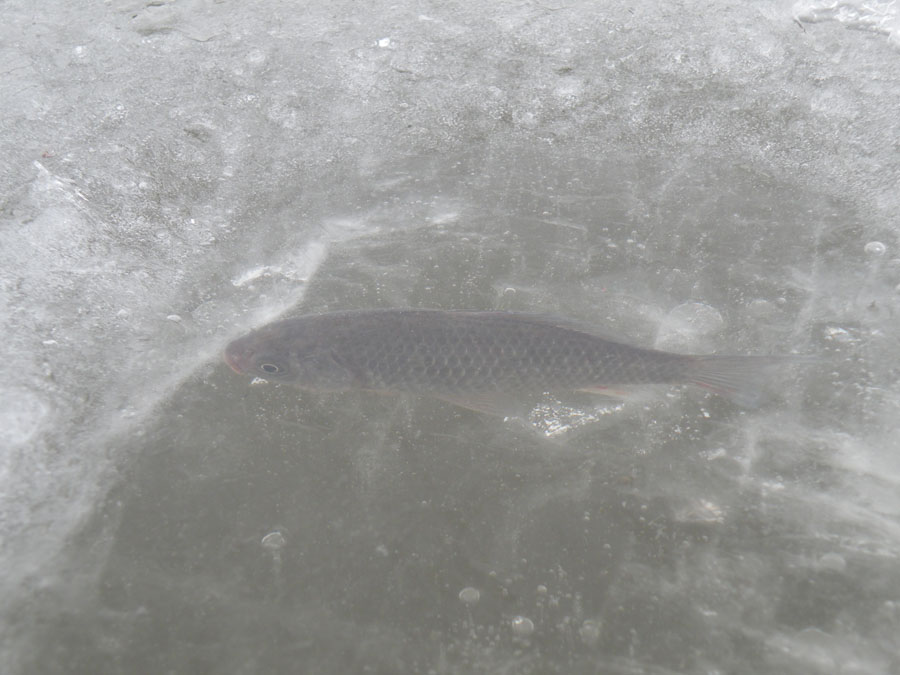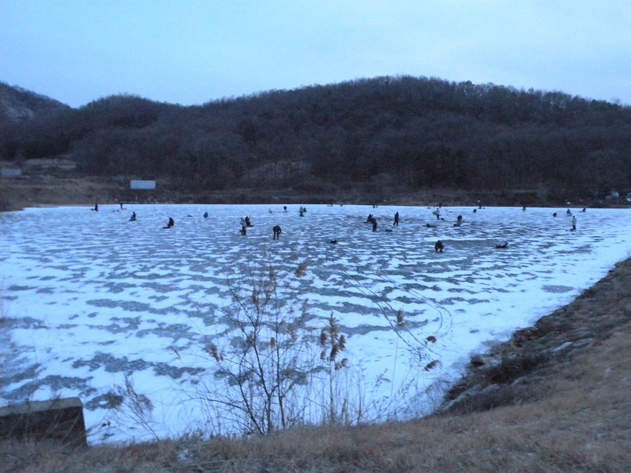 필자는 소류지 중앙과 가장 자리에 얼음을 뚫어보니 중앙은 수심이 1m 정도, 가장자리는 40~50cm 정도이다.