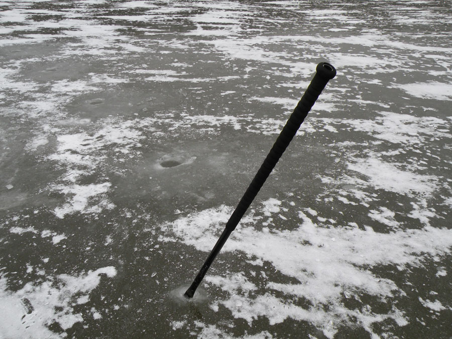 저수위를 감안해 소류지 중앙에 채비를 하고 지렁이를 달아 얼음 구멍에 찌를 세워본다.