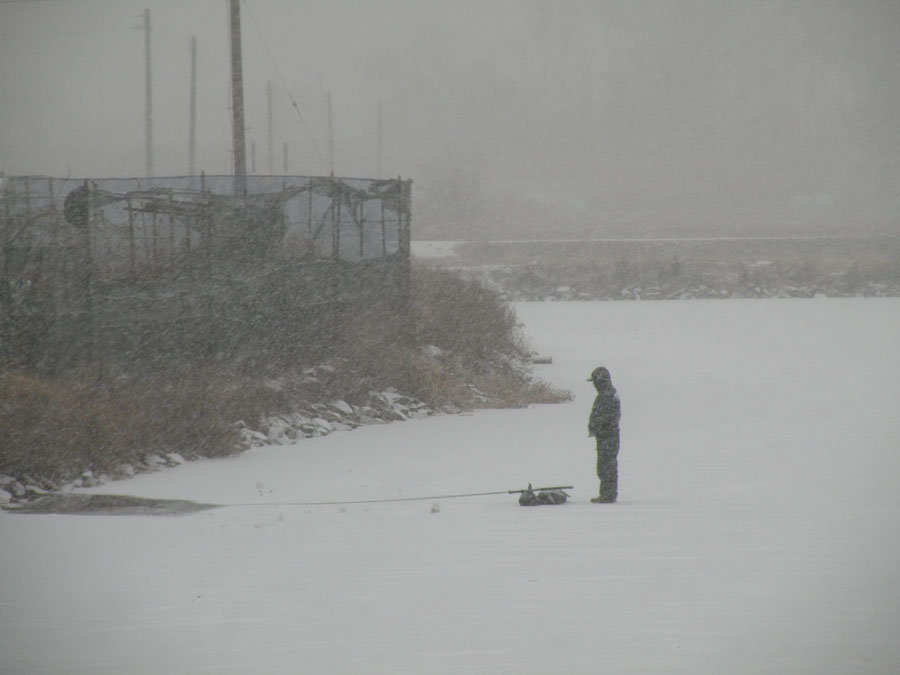 엄청 내리는 눈속 초지수로에서 낚시 중인 조사님 (대단하십니다)