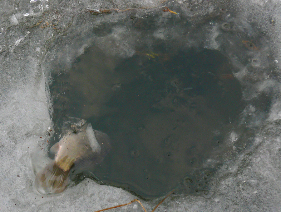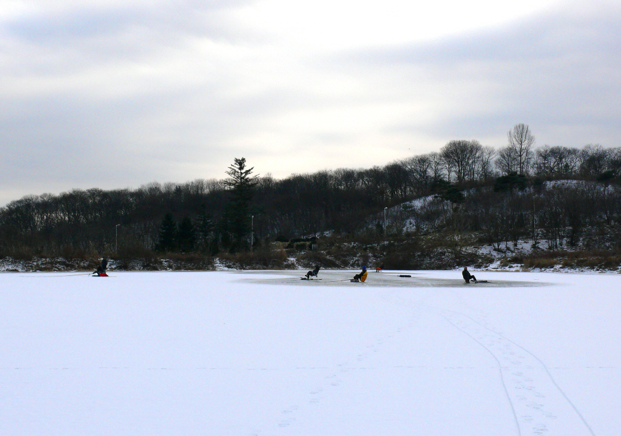 계속해서 내린 눈으로 인해 소류지는 하얗게 덮혀 있었고, 누군가 전날 두구멍을 뚫고 낚시를 한 것같아 보인다.