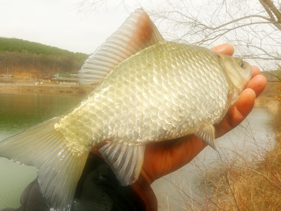 윤교수님이 걸어낸 체고 좋은 소류지 붕어입니다.