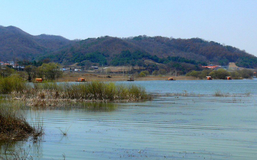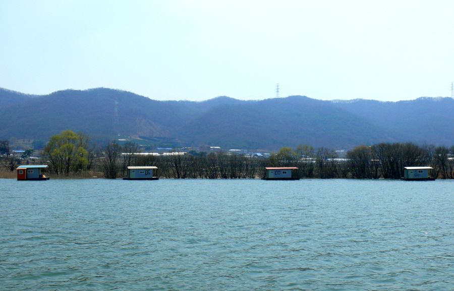 안골지 상류권 수초대에 자리잡은 작은 좌대들입니다.