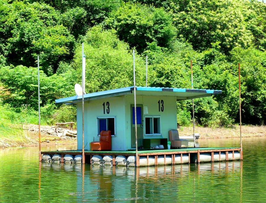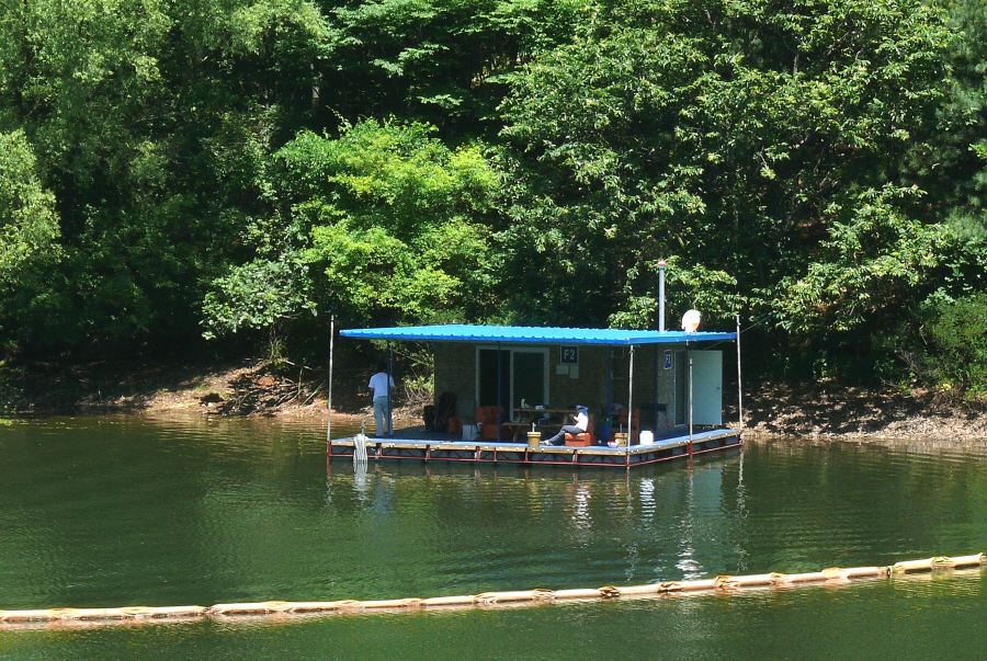 관리소 앞 중류권 곳부리에 위치한 수상좌대 전경.