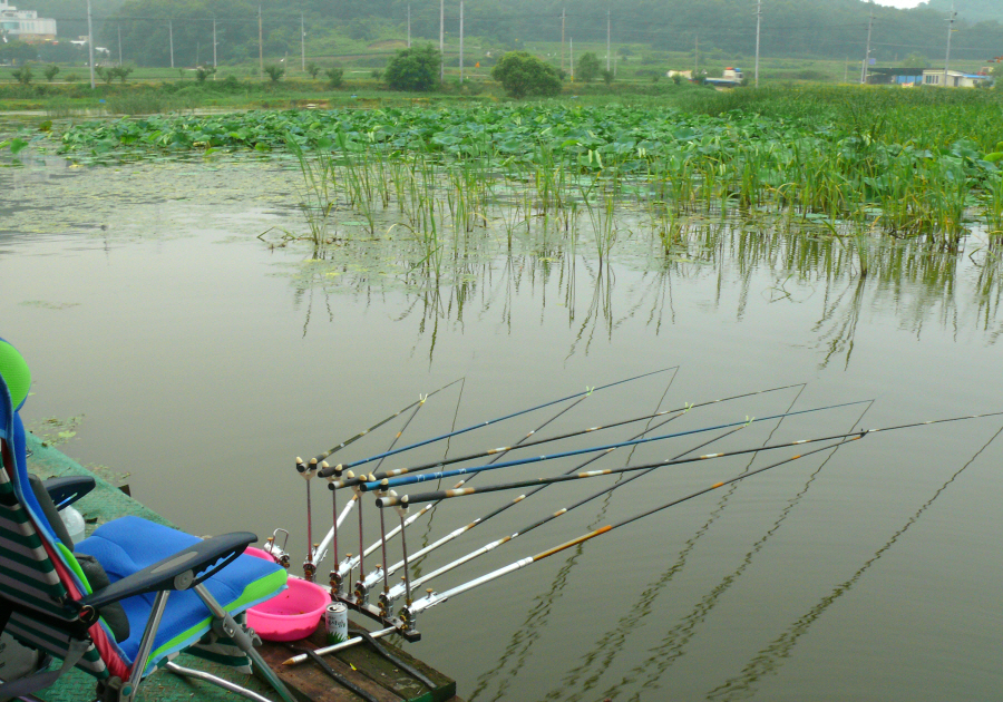 에어콘에 땀을 식힌 다음 대편성을 하고, 수초 사이사이에 외봉으로 떡밥 채비를 밀어 넣고, 콩알 낚시로 밑밥을 몇번씩 주었다.