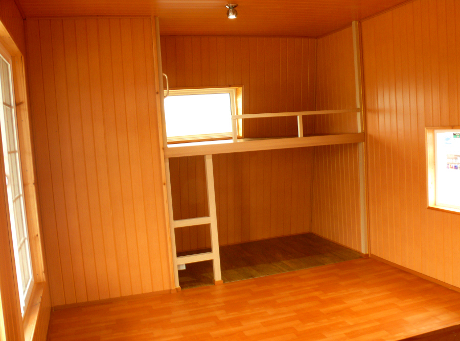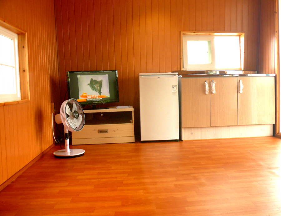 깨끗하게 나무로 처리된 내부와 아이들을 위한 2층 침대 그리고 냉장고, 선풍기, LED TV가