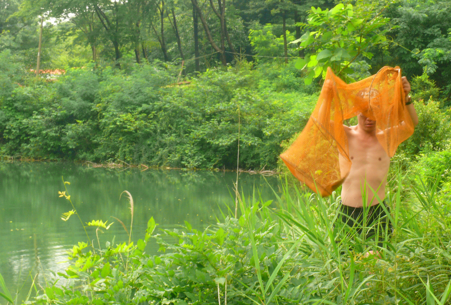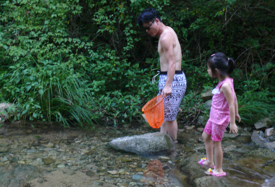 맨꽝님과 민서는 뜰채로 피라미 잡는 중이네요.