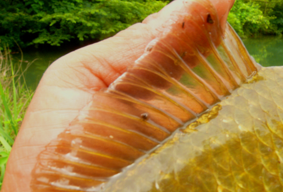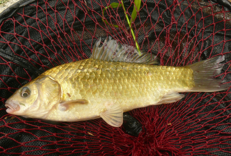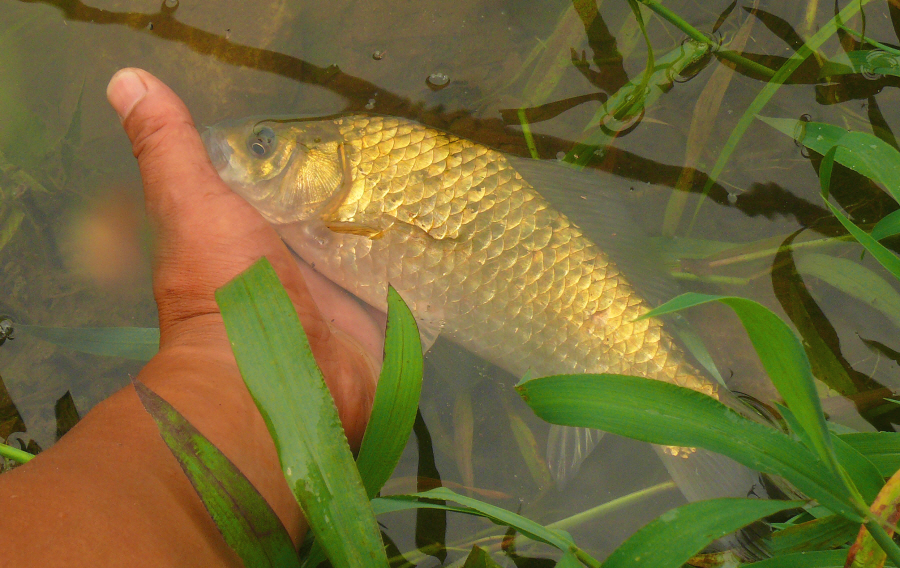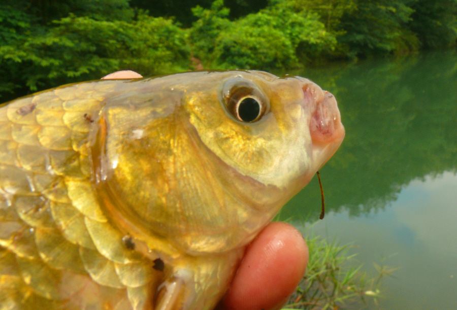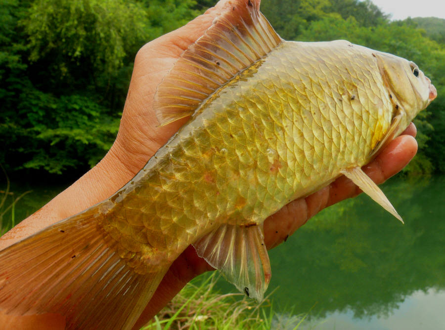 마눌님 살림망에 있던 8치급은 물속으로 사라져 버렸고, 맨꽝님이 황금빛 붕어를 보여줍니다.