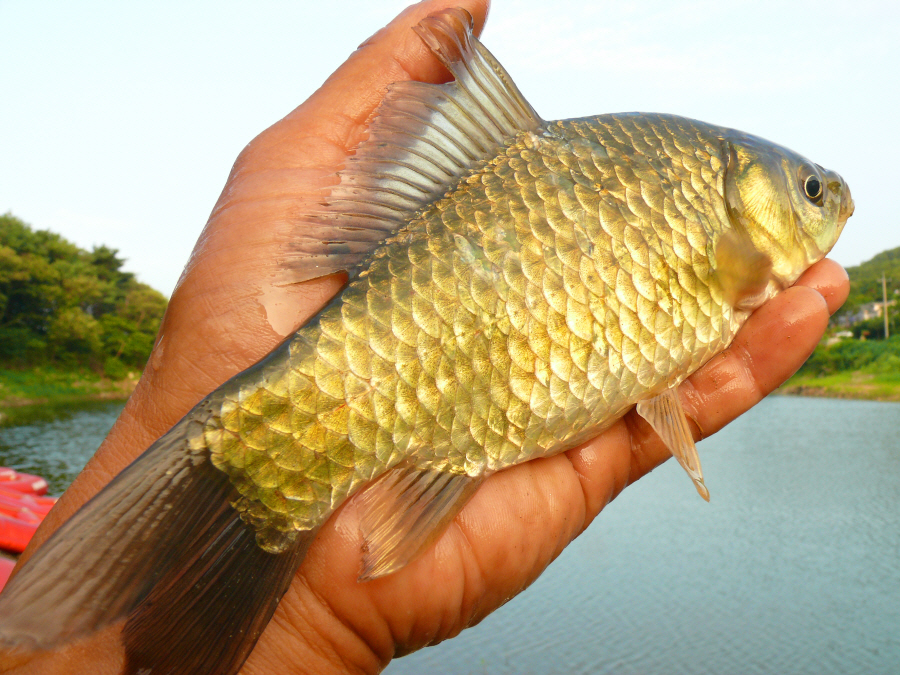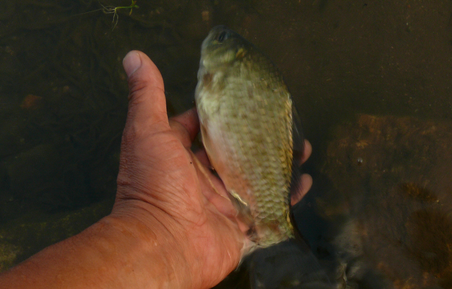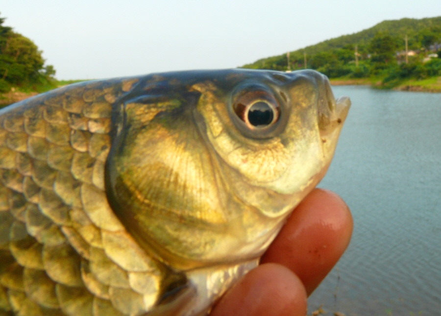 제법 멋지게 올리다가 끌고 들어가는 것을 챔질을 해보니 6치급 붕어가 앙증맞은 모습으로 걸려 나옵니다.