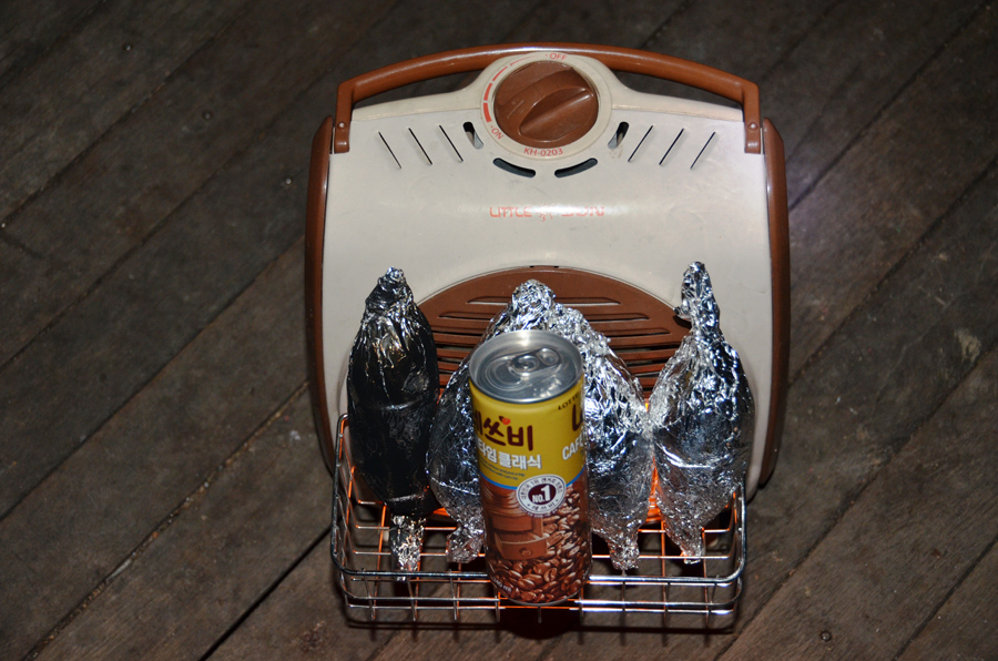 이렇게 고구마를 굽고 커피를 끊여 하나씩 나누어 드렸습니다.