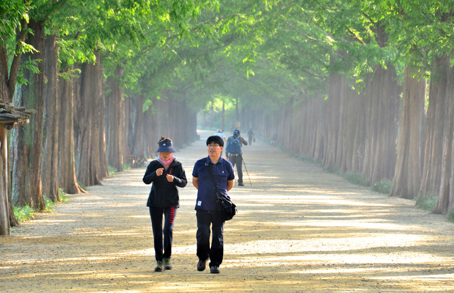 이른 아침에 메타세콰이어 길을 걷는 동반자