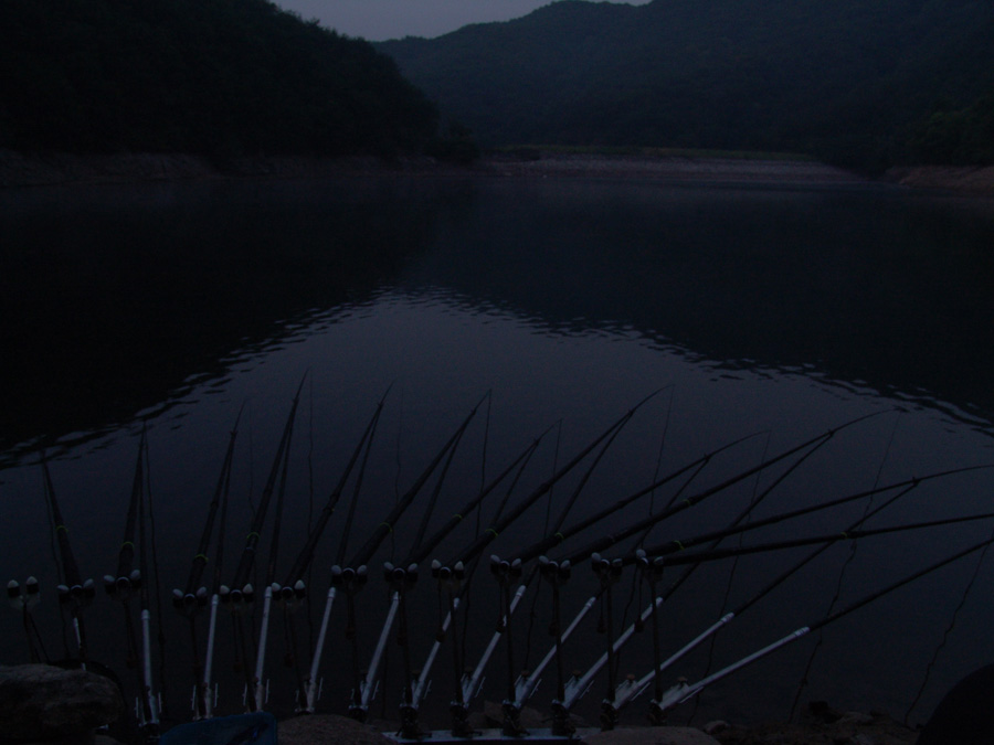비 오듯이 흘러내리는 땀을 훔치며 바쁘게 중류권에 낚싯대를 편성하다보니... 이런~~ 어둠이 깊게 내려오고...