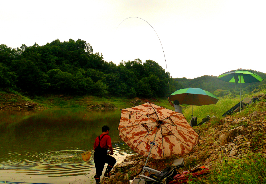 제발 붕어이기를 기대하고 케벙이님은 사진을 찍고 쥴리는 뜰채를 가져가 걸린 놈을 건져내는데... 월척급 붕어다.