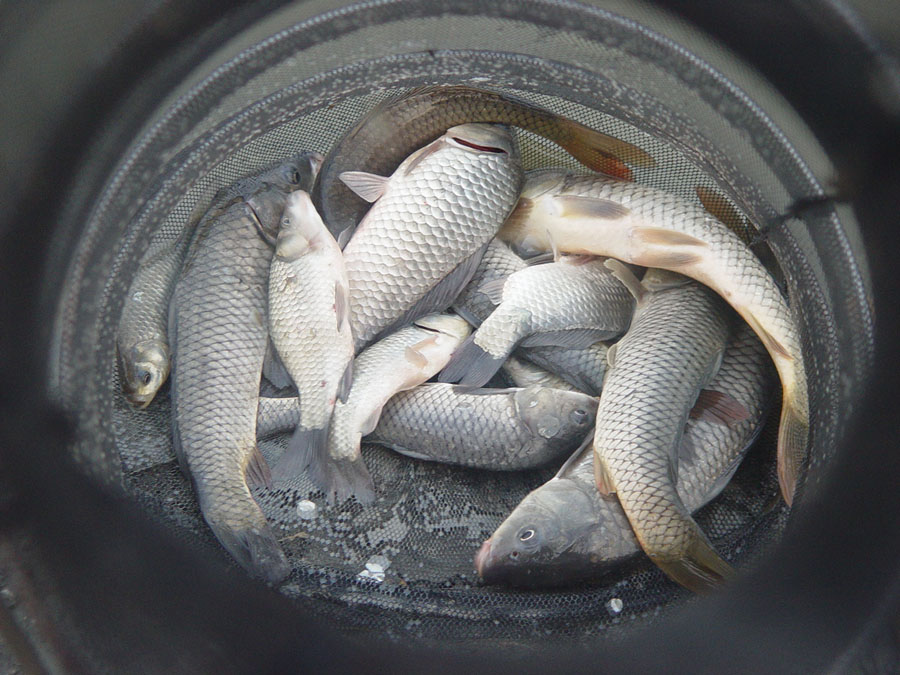 취재진의 살림망입니다... 잉어가 우세한 가운데 월척급도 보입니다.