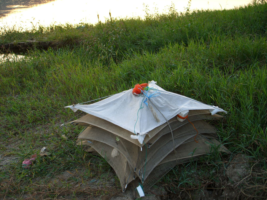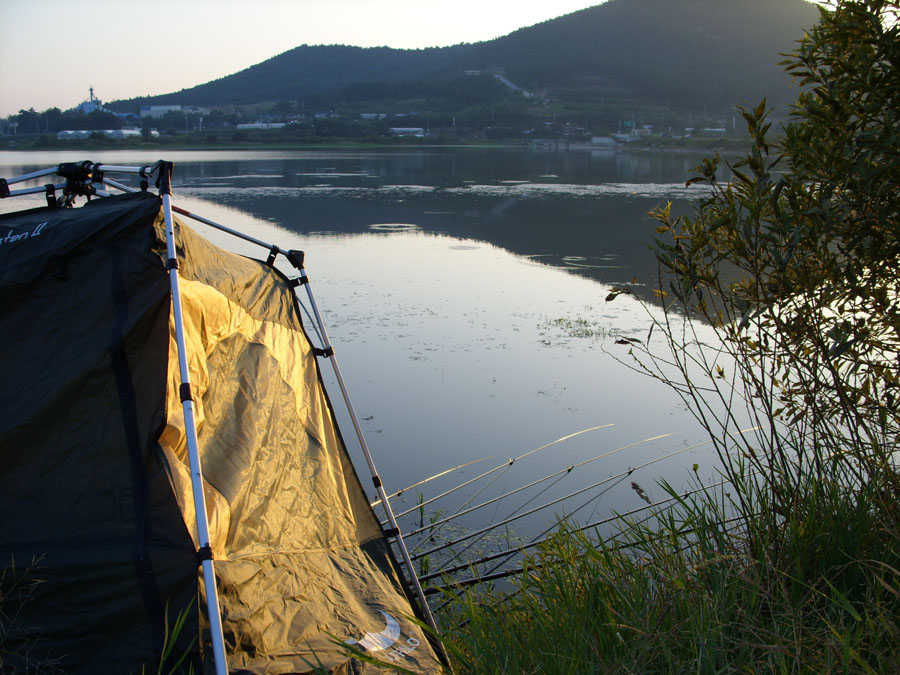신문붕어님은 필자보다 조금 윗쪽에서 우측으로 7대를 좌측으로 5대를 채비하고, 새우와 참붕어를 꿰어 포인트에 투척한다.