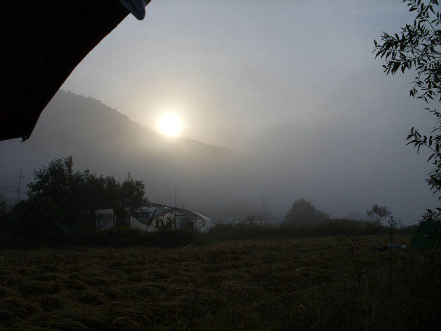 자정무렵 추수가 끝난 밭자리에 펴놓은 신문붕어님의 텐트로 또 하루를 묵으러 들어간다.