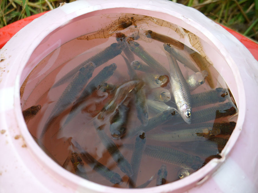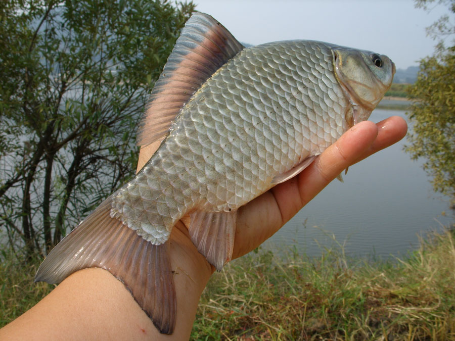 타이밍을 잡아 챔질을 하니 좌우로 물을 가르던 7치급 붕어가 올라온다.