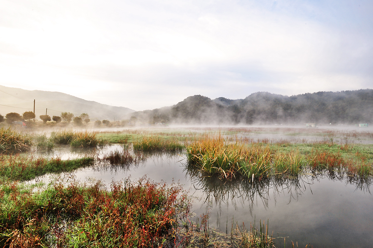 환상속의 물안개와 따스한 햇살이 합쳐져 장관을 이룹니다.