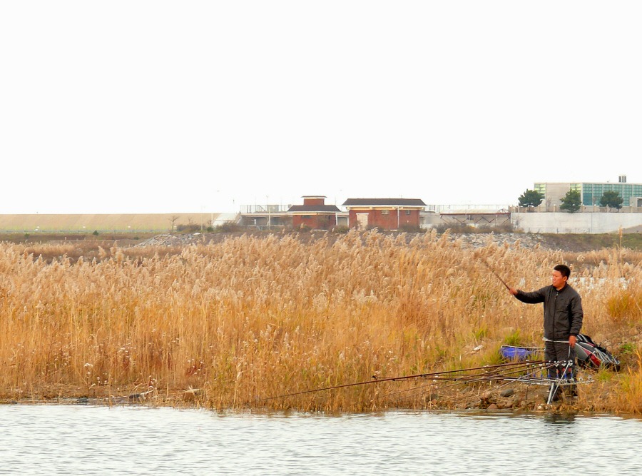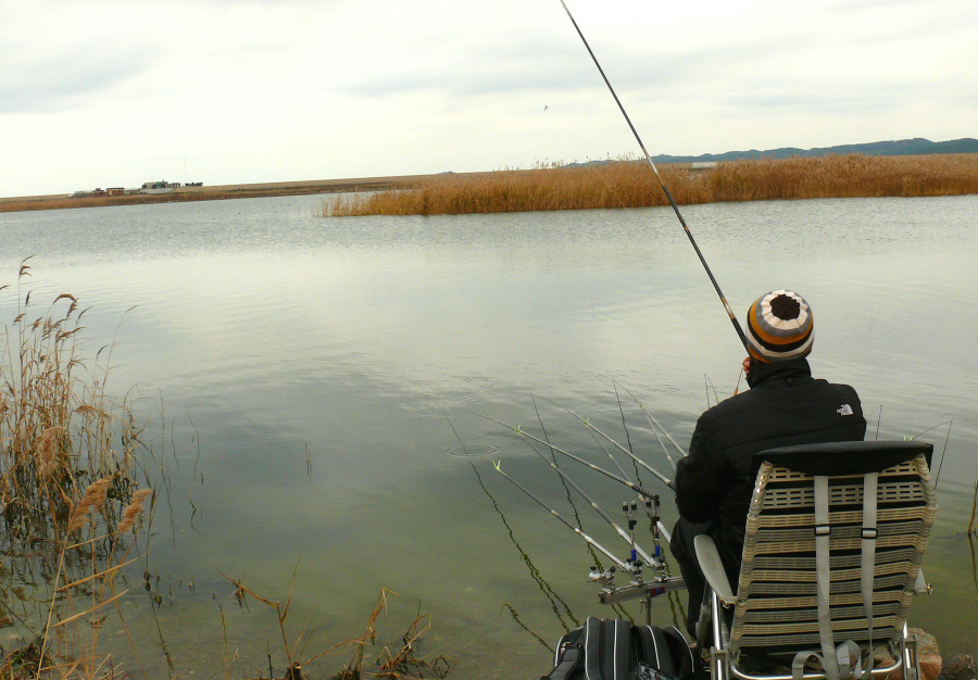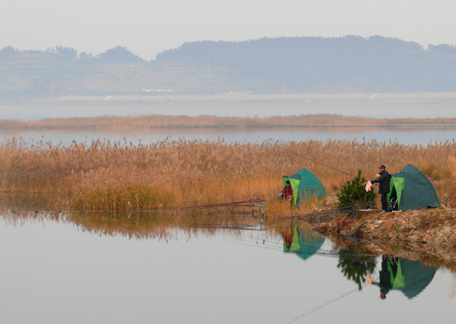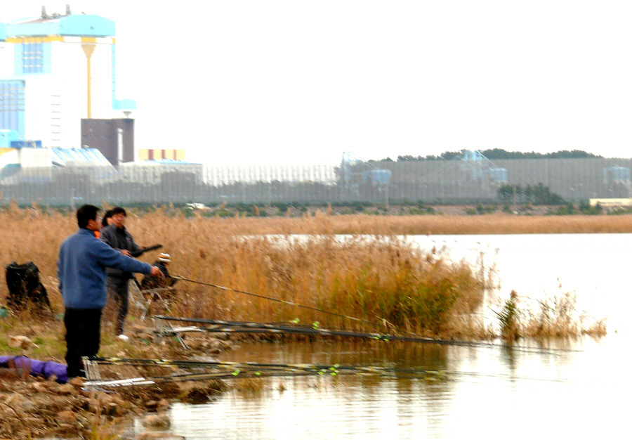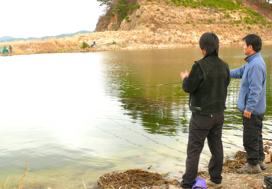 바람이 심하게 불지만 모두 굳굳하게 자리를 지키면 낚시를 한다.