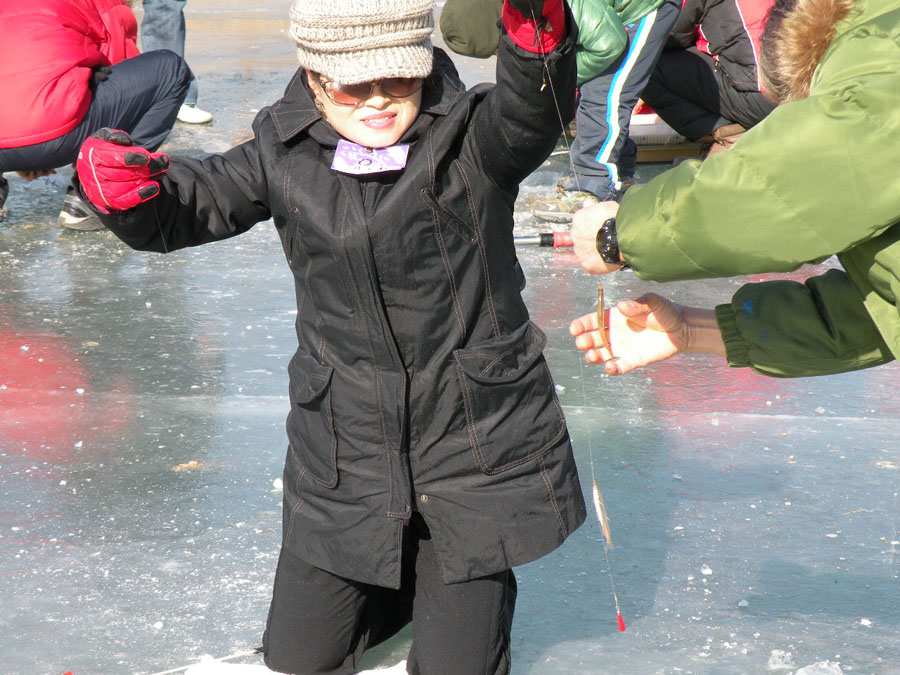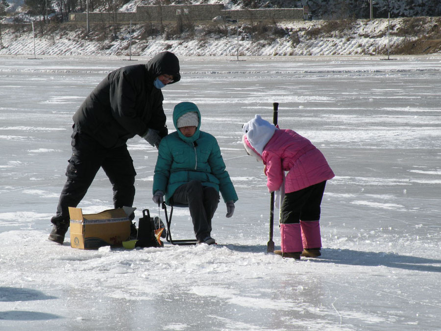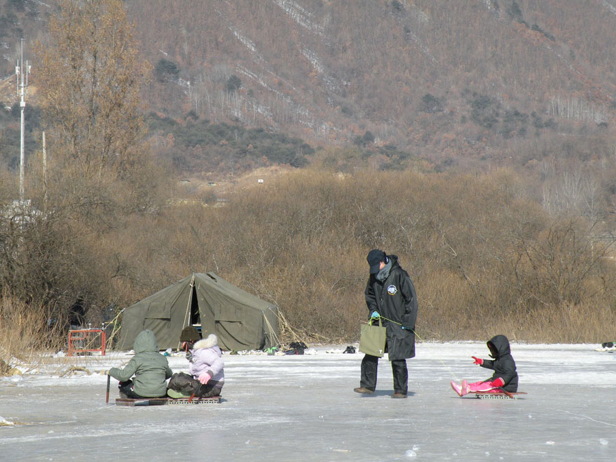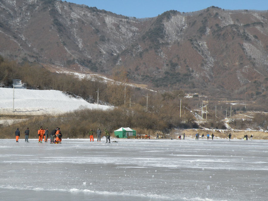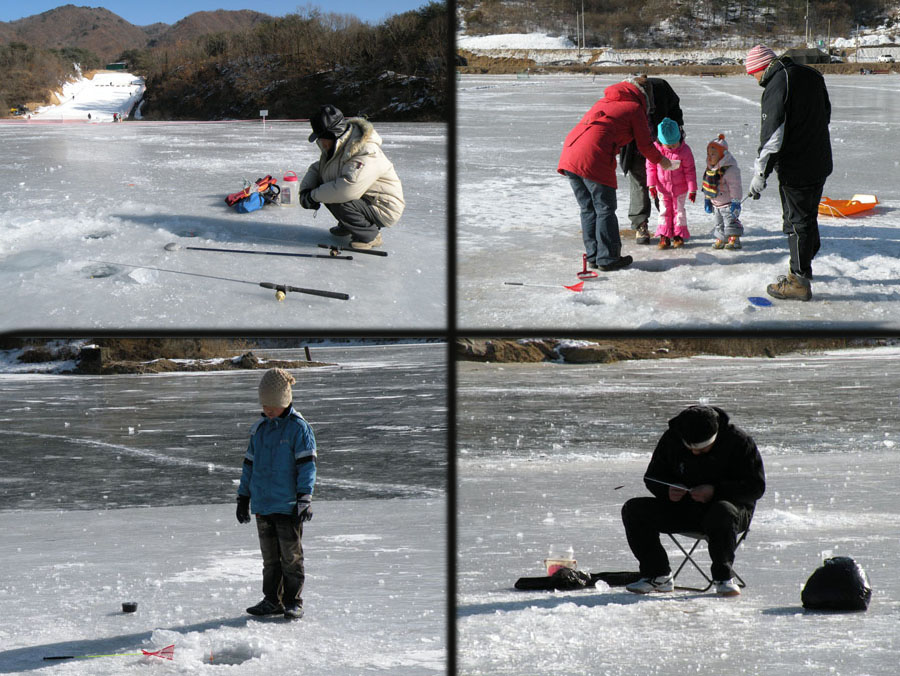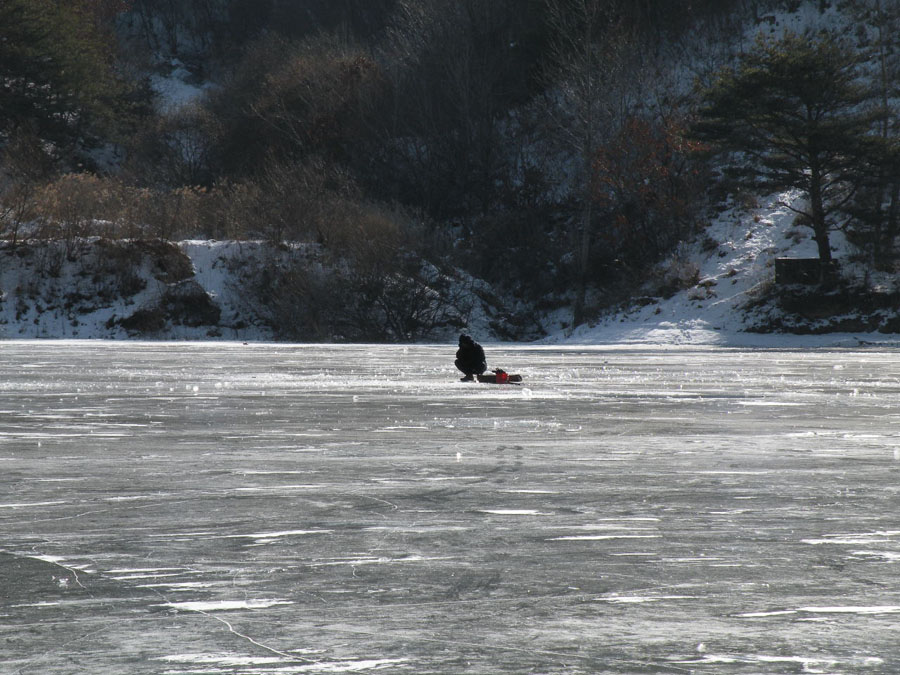 군인들도 잠시 스케이트를 즐기고 있고, 일반인들도 구멍을 뚫어 빙어낚시를 즐기고 있다.