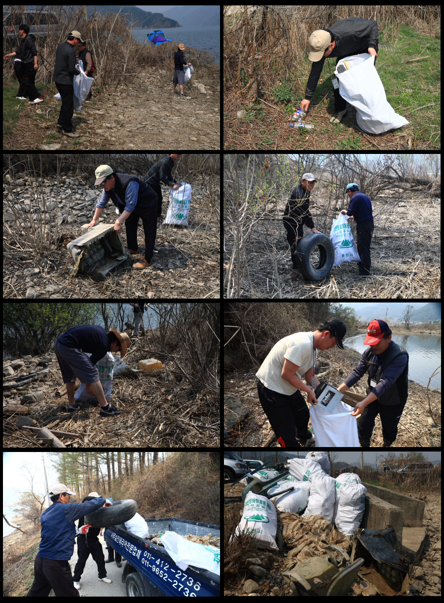 인원을 나누어 춘천시 어촌계의 협조를 받아서 주변 청소부터 합니다.