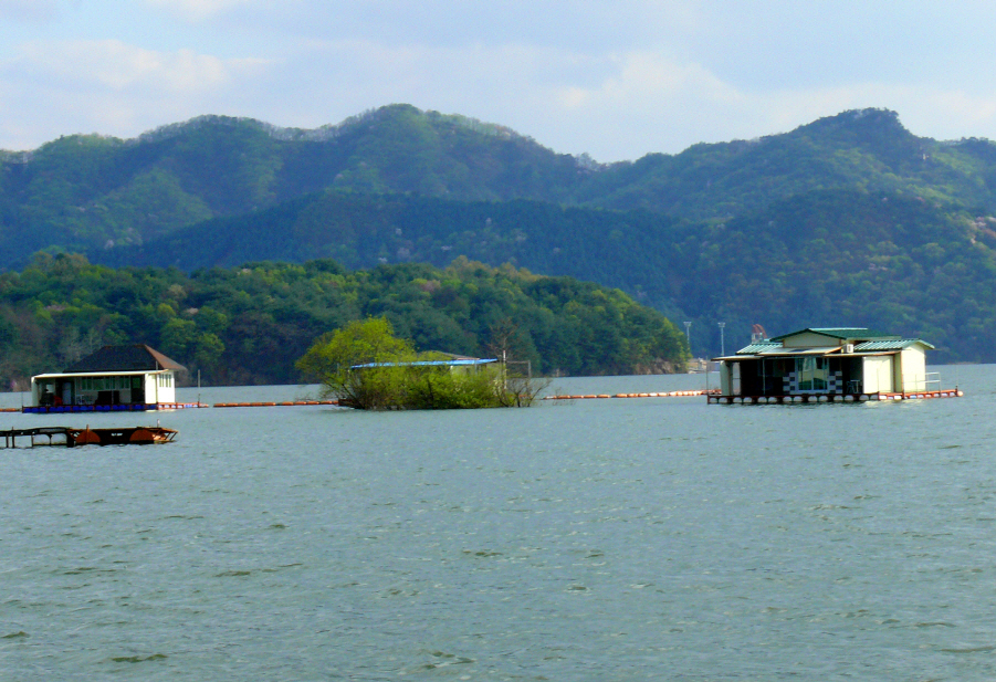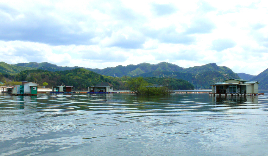 의암댐 자갈섬 낚시터 관리소 좌측편 콘도형과 팬션형 좌대 전경