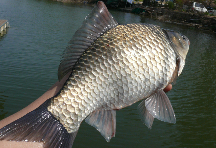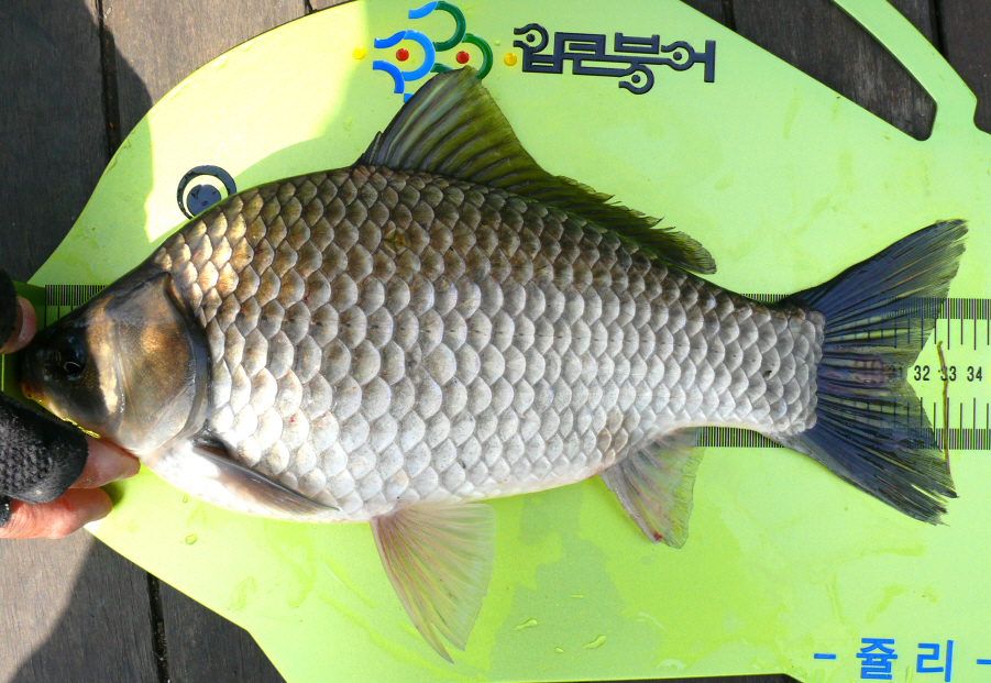 해가 지고 사방이 어두워지면서 82yu님이 한수 걸어 내었는데 한 눈에 보기에도 멋진 월척급 붕어다.