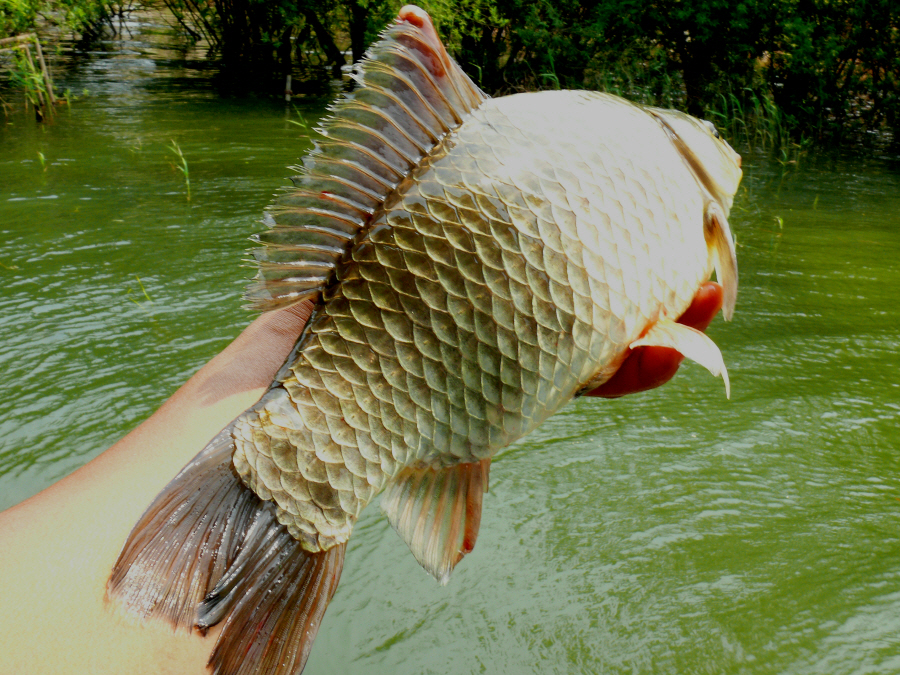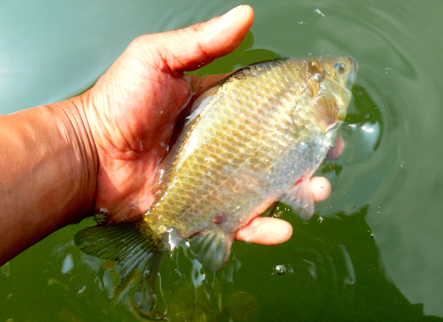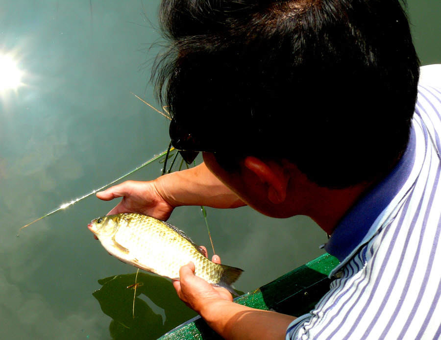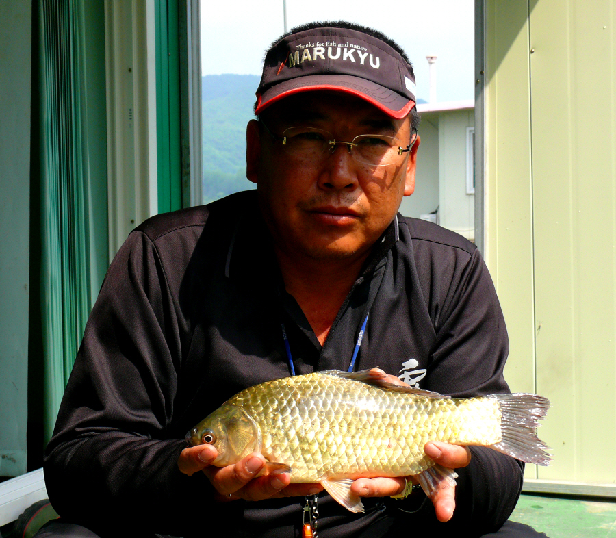 황금색 채색을 띈 멋진 월척급 토종붕어를 걸어 낸 윤교수님도 흥분을 가라 앉히지 못한다.
