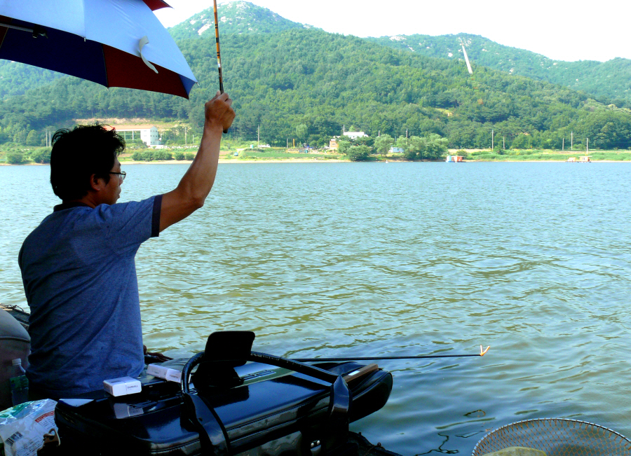 더위 때문에 찬 음료를 마시면서 생자리에도 집어가 된다고 10분 여 동안 휴식을 취하고 다시 낚시를 하니 순식간에 붕어가 빠졌다.