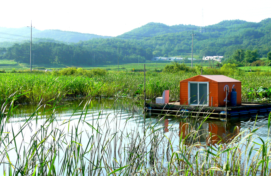 필자는 상류권 연안과 같이 있는 수상좌대에 올라 15척 한 대를 펴고 마름수초와 갈대 수초가 인접한곳에 수초를 제거하고 채비를 드리웠다.