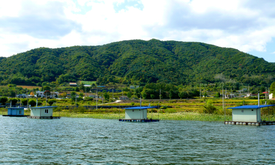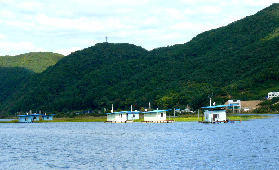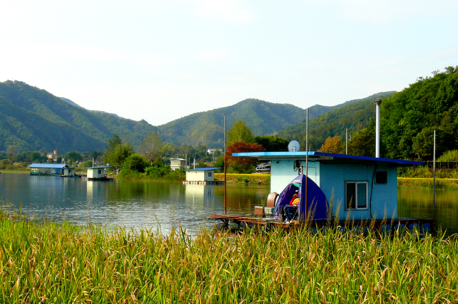 연안 부들과 갈대수초대에 편성되어 있는 수상좌대들 전경
