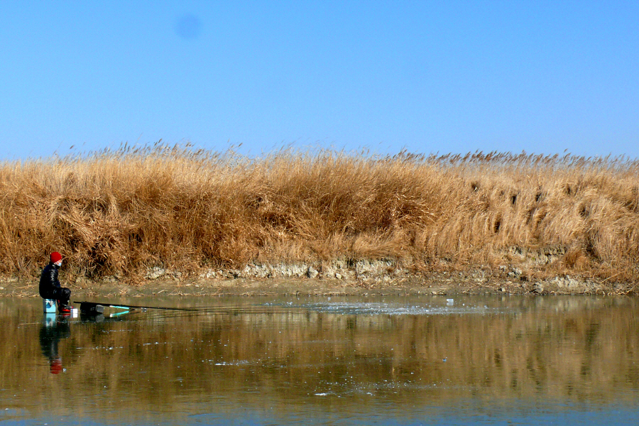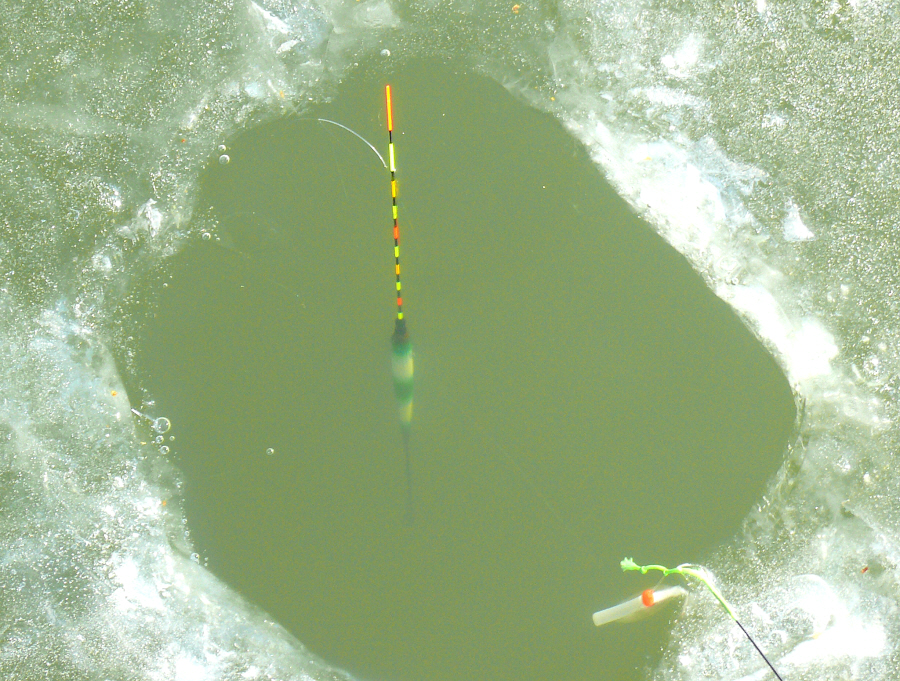 첫 얼음구멍에 싱싱한 지렁이를 두마리 꿰어 구멍속에 채비를 안착시켰는데 자라난 말풀로 인해 몇번의 고패질을 해 주어야만 채비가 안착이 된다.