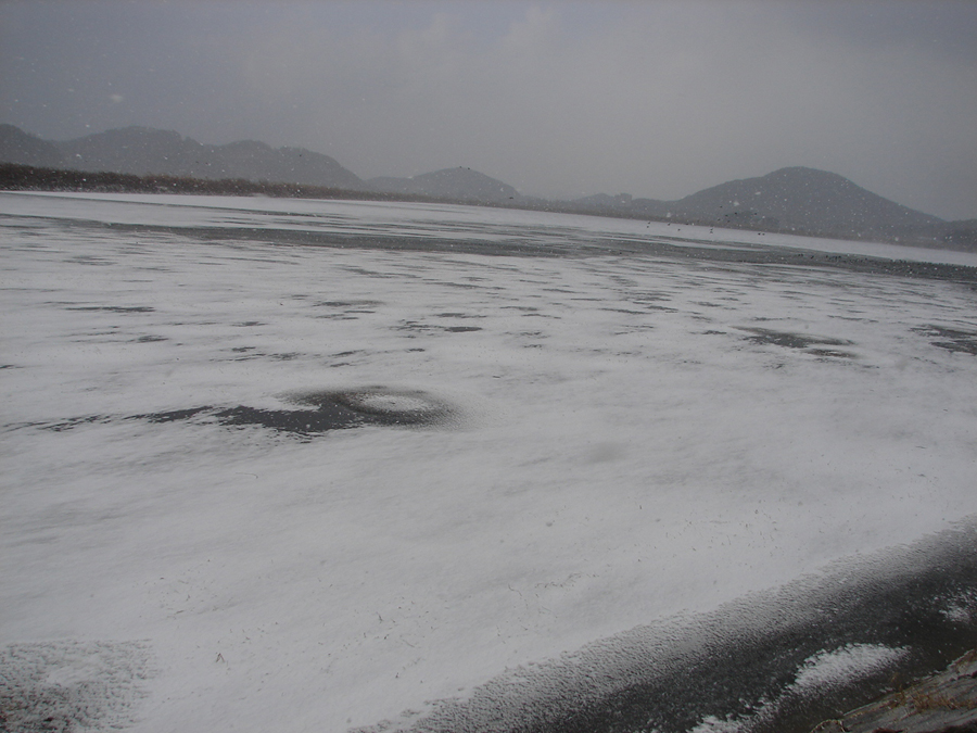 전체적인 얼음두께는 4~5센치정도되며 내일 아침부터는 더 두꺼워져 첫 얼음낚시가 가능할 것 같습니다.