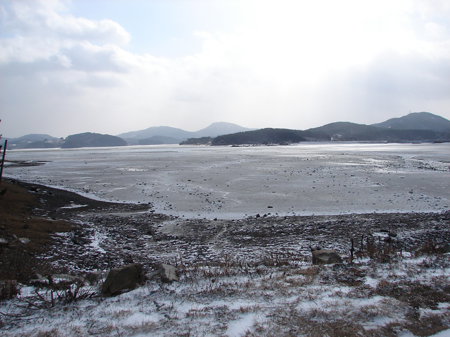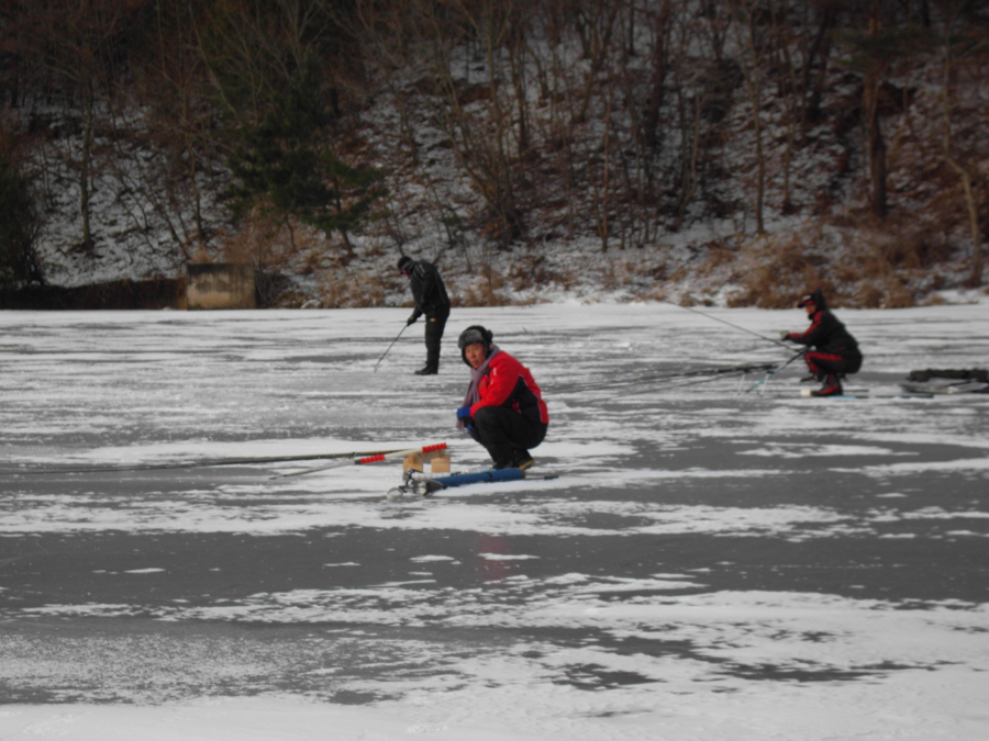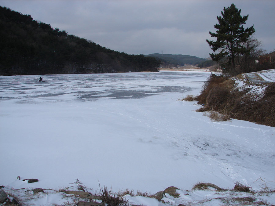 곧바로 반계지에 도착하여 하류권에 얼음구멍을 '슝슝슝' 파고 지렁이를 예쁘게 꿰어 구멍속에 넣을 무렵.