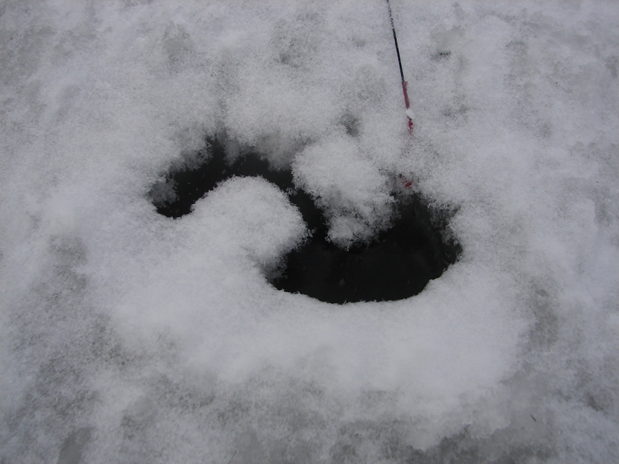 얼음구멍에 눈이날려 쌓이고 있습니다.