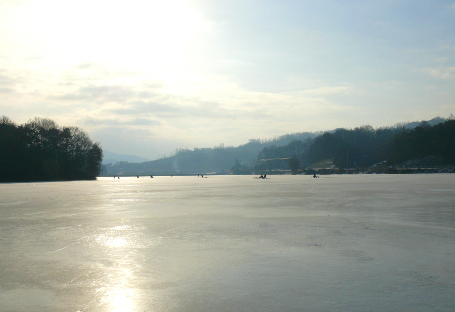 해장국으로 몸을 뜨근하게 만든 다음 찾아간 얼음낚시에 터가 세기로 유명한 관성지.
