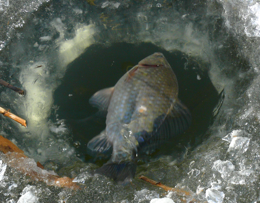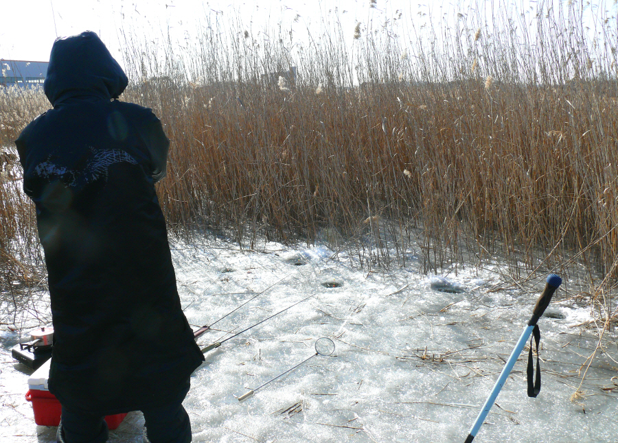첫번째 뚫은 구멍에서 입질을 받지 못하고 다시 다른 수초대에 구멍을 뚫고 낚시를 시도해 보았지만 입질을 받지 못했다.