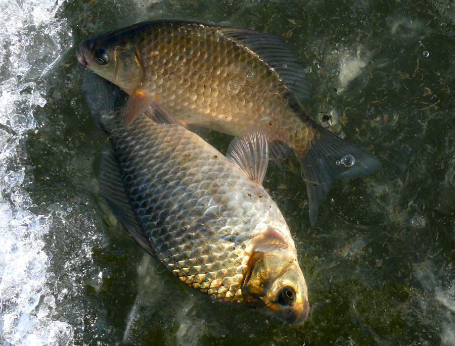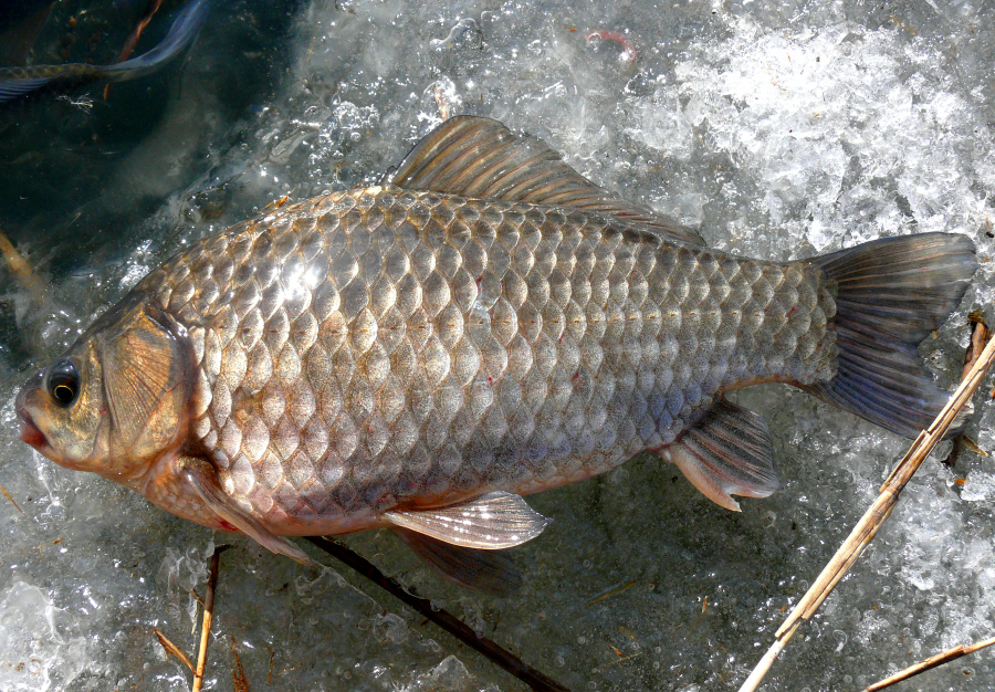 가볍게 챔질을 해보니 제법 앙탈을 부리면서 얼음구멍 밖으로 얼굴을 보여주는데 체고 좋고 깨끗한 8치급 붕어다.