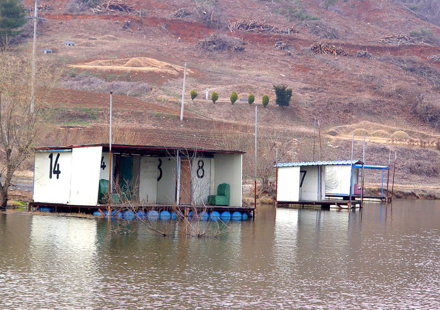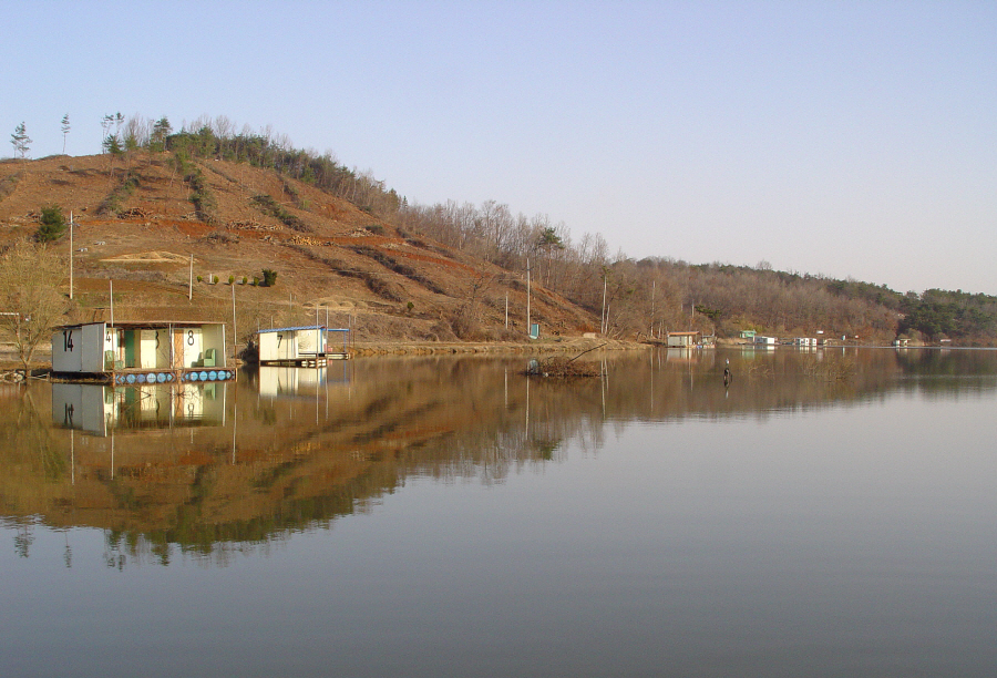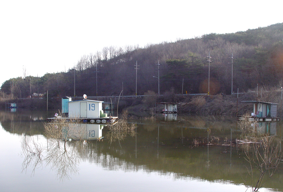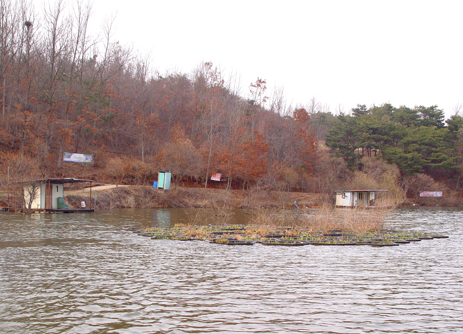 가교리지 상류권 연안에 배치되어 있는 수상좌대입니다.