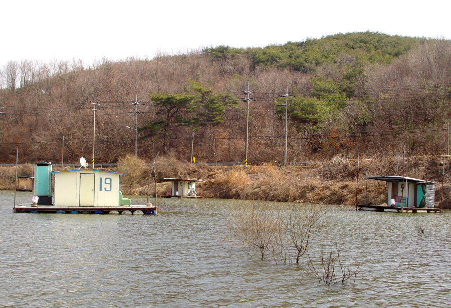 연안에 접안되어 있는 좌대들은 차에서 내려 바로 낚시를 할 수 있습니다.