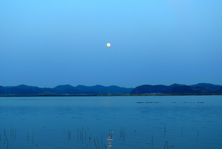 해가 졌는데 보름달이 둥그렇게 떠 올랐습니다.