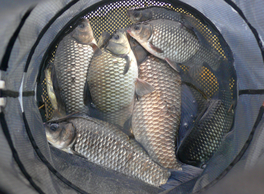 씨알 좋은 붕어들이 살림망에 담겨있습니다.